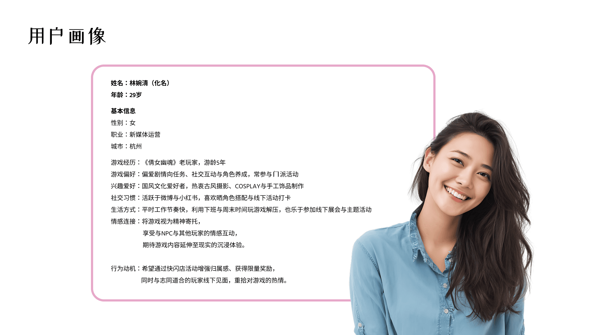 Key insights revealed that players value immersive storytelling, meaningful social interaction, and ritualised participation over spectacle alone. Many players already treat the game as a form of emotional refuge and self-expression, actively sharing gameplay moments, cosplay, and offline experiences on platforms such as Weibo and Xiaohongshu. This highlighted a clear opportunity: extend the game’s emotional and narrative depth into a real-world setting that supports identity, belonging, and replayable participation.