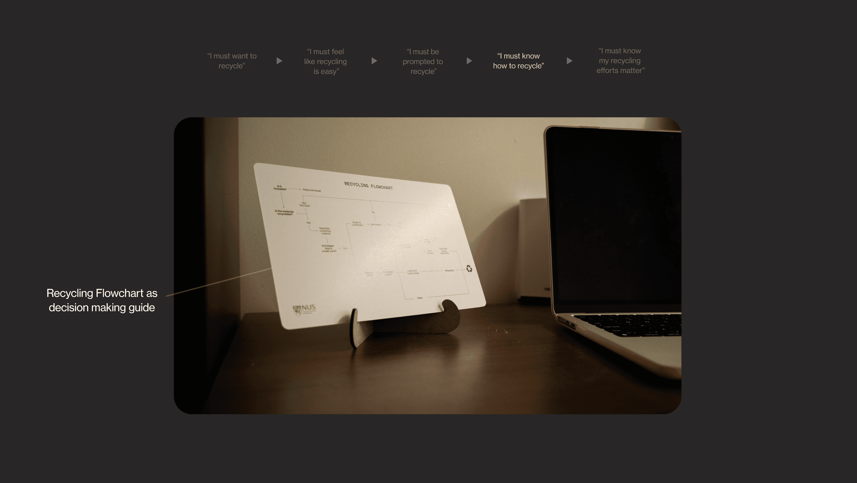 Instead of attempting an exhaustive list of recyclables, we designed a recycling guide that teaches decision logic, the thought-process behind correct sorting. Designed to “live in the room,” it functions as a stable reference point whenever uncertainty appears.