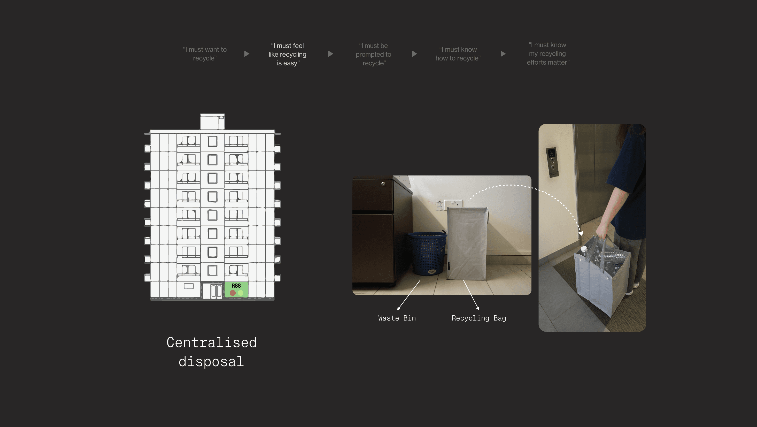 We reframed “easy” as a relative condition: recycling must compete with the convenience of throwing away. By pairing a policy shift that centralises disposal behavior, and a personal recycling bag for in-room accumulation, the system makes recycling and general waste disposal comparable in effort, reducing the everyday friction gap that currently kills follow-through.