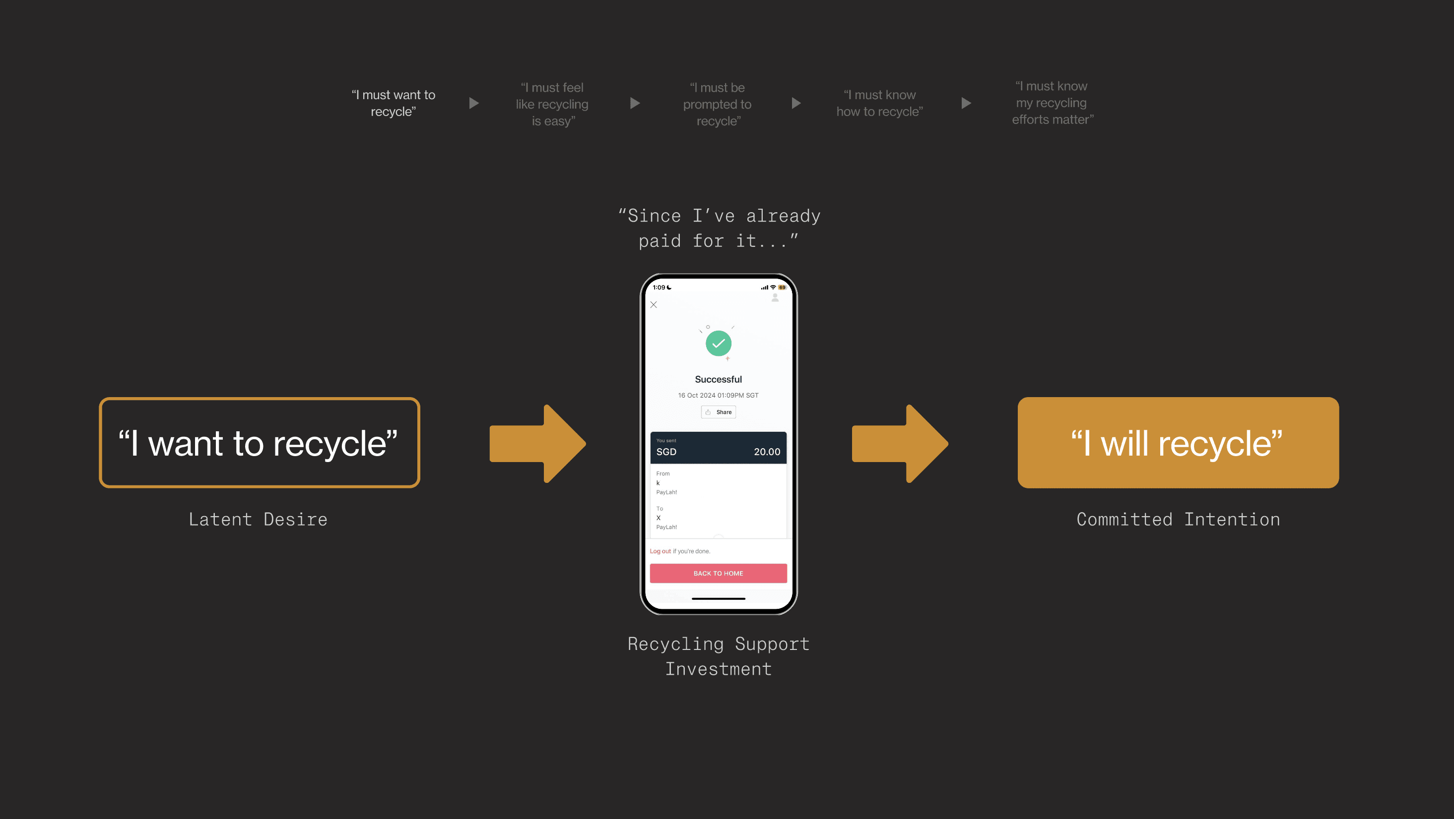 Although would-be recyclers have latent motivation, the program introduces a buy-in deposit system to turn desire into committed intention by leveraging loss aversion. It creates “skin in the game” without relying on long-term punishment.