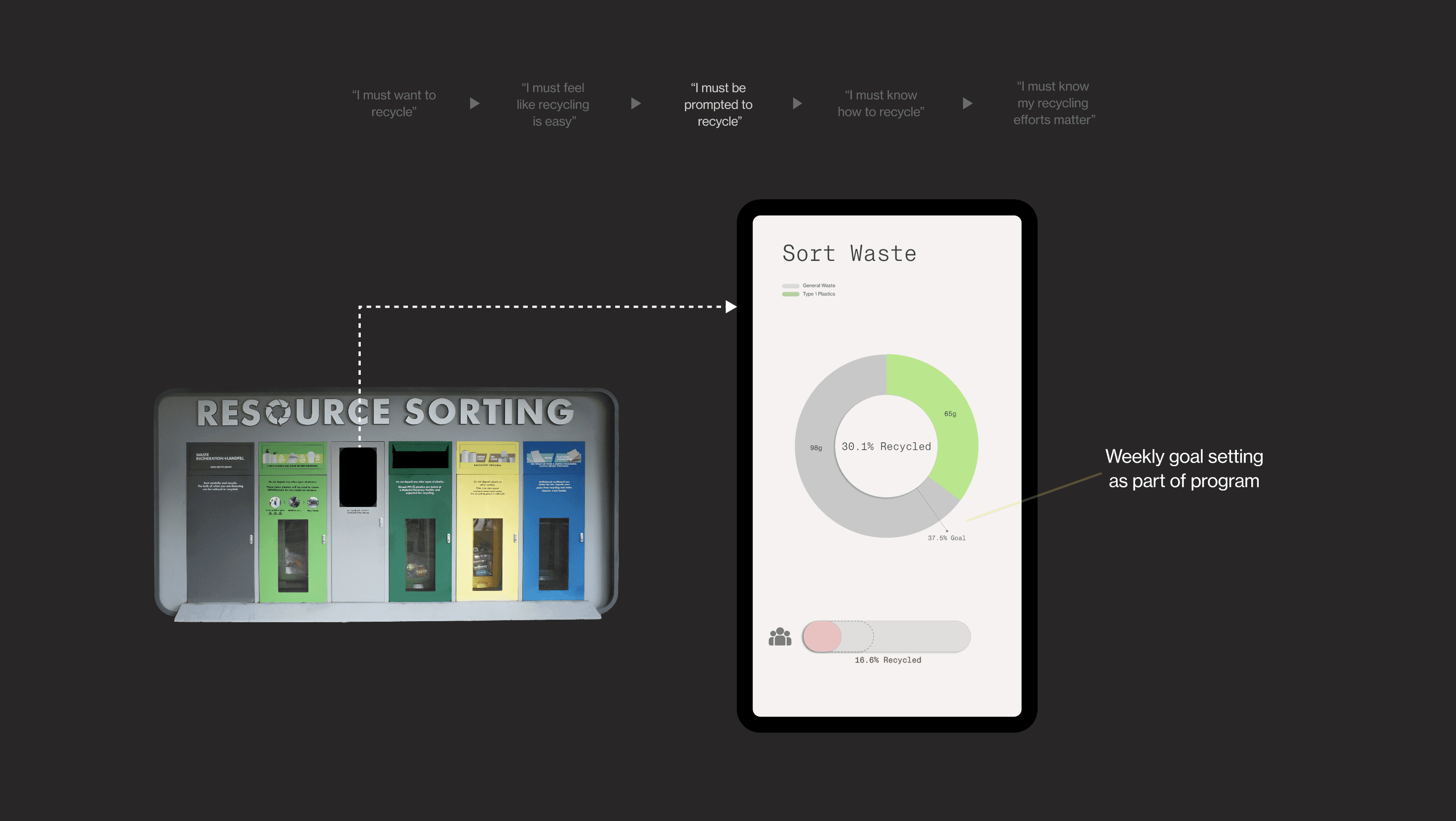- Materials: tools + infrastructure that make recycling physically easy